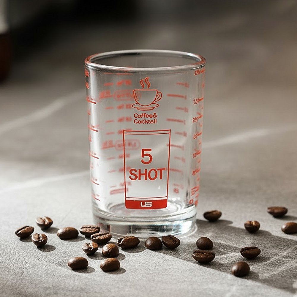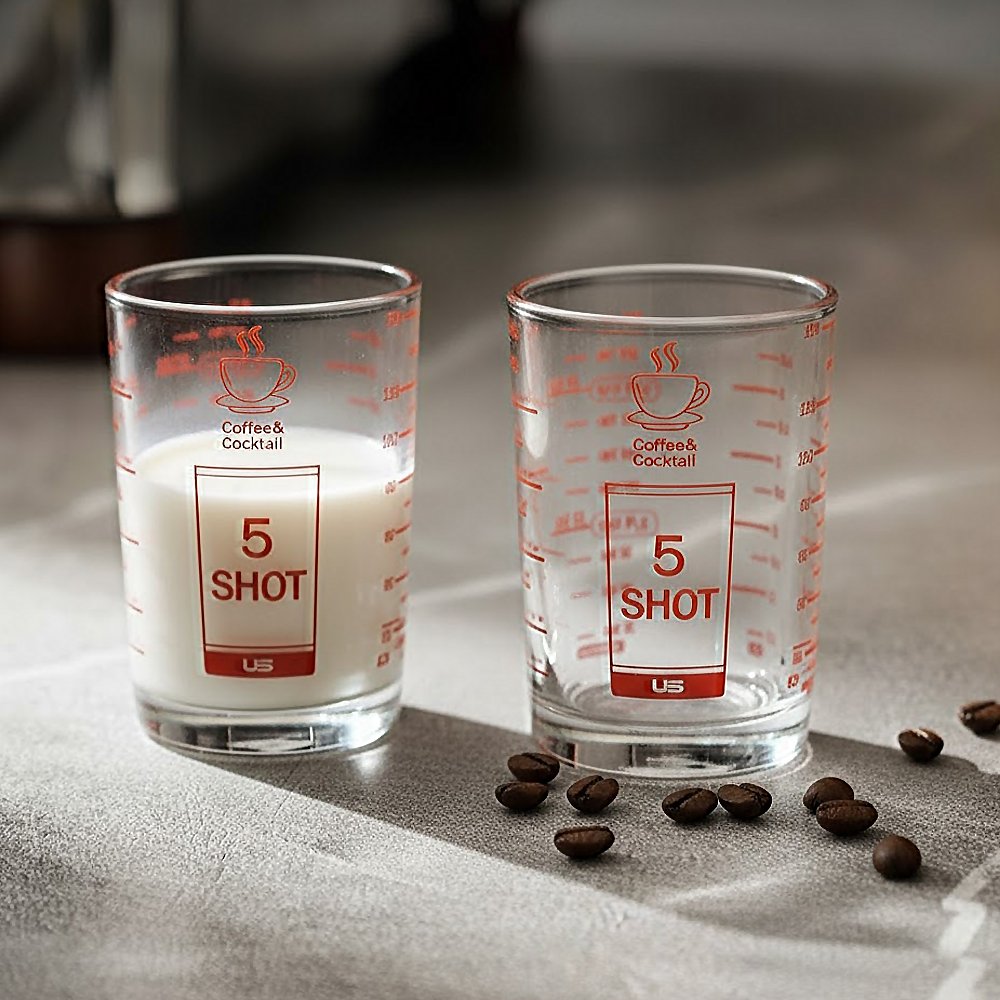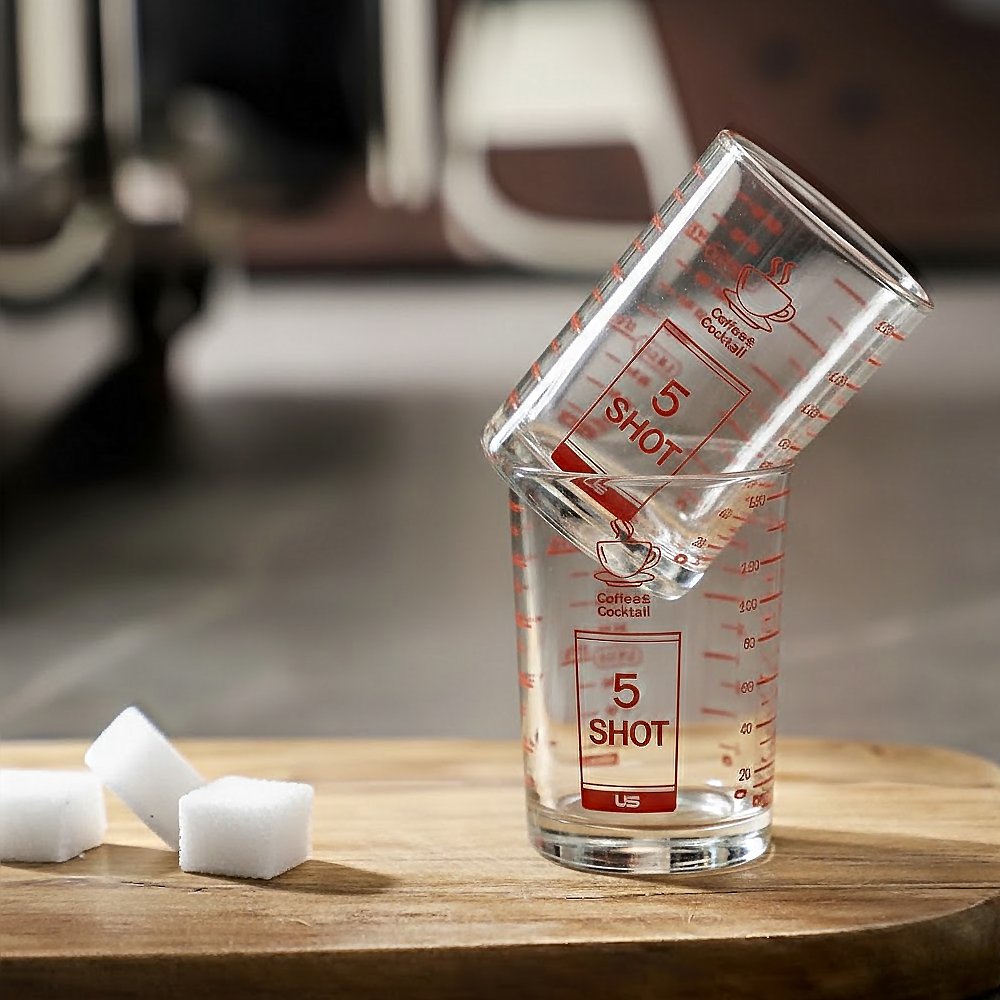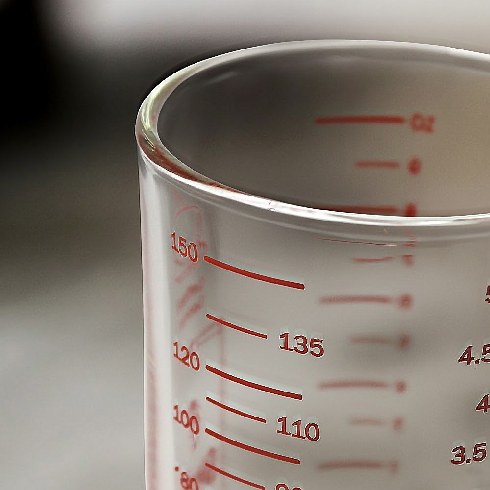 แก้วตวงของเหลวต่างๆ เช่นตวงส่วนผสมของเครื่องดื่ม น้ำเชื่อม นมข้นหวาน ชา กาแฟ แบบมีสเกลวัดระดับถึง 4 แบบ ช้อนโต๊ะ ออนซ์ มิลลิลิตร ถ้วย